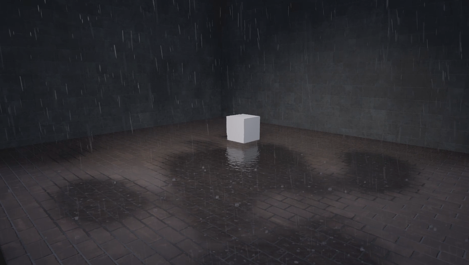 This environmental rain uses some clever shader work to let environment artists further along in the pipeline paint puddles onto a mesh in realtime. You can see below that after the material has been applied to your mesh or landscape, you can paint into the red channel of each vertex in the editor in real time. This is a high quality shader utilizing tesselation and vertex displacement, so it is a high poly setup. This would work fine in a small alley environment for instance, but in a larger context this would just need to be applied to the landscape materials with different blending layers. Same result just different method, this one being more expensive and a little bit prettier.