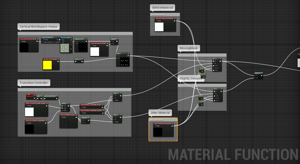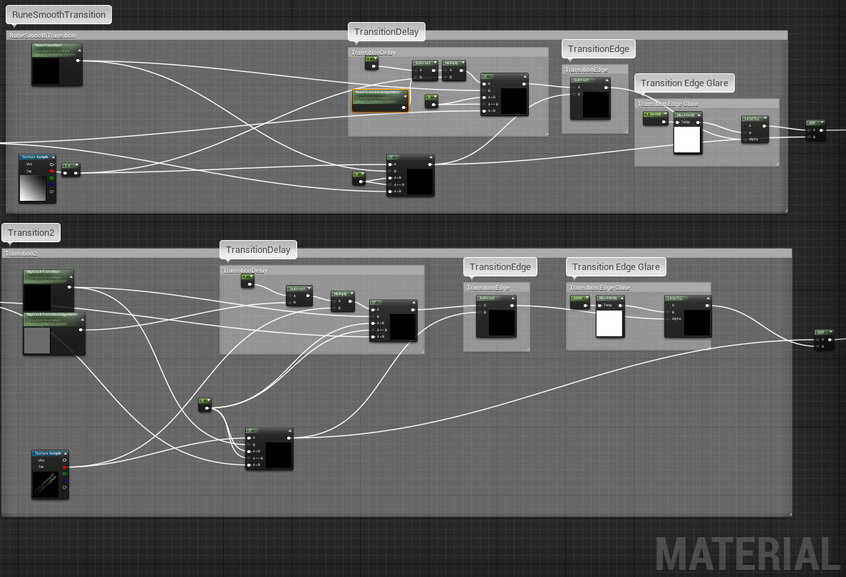 The shining light that pans across the runes and crack is done with two material transitions, one delayed slightly behind the first. This line is given a bright, black-body emissive material to show the shine. Pardon the spaghetti. I'm still waiting for Epic to add reroute anchors for the connections like they have in their Blueprint editor.
