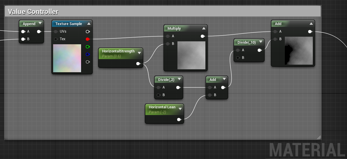 I gave it four inputs: how fast the distortion parameters pan in the X and Y (U and V) directions; and how much it shifted each texel on the X and Y (U and V) directions by scaling the noise values. These noise textures I have imported are used for the lack of a robust noise function in Unreal's material editor. Hopefully it becomes a bit more pliable in the future for UV play.